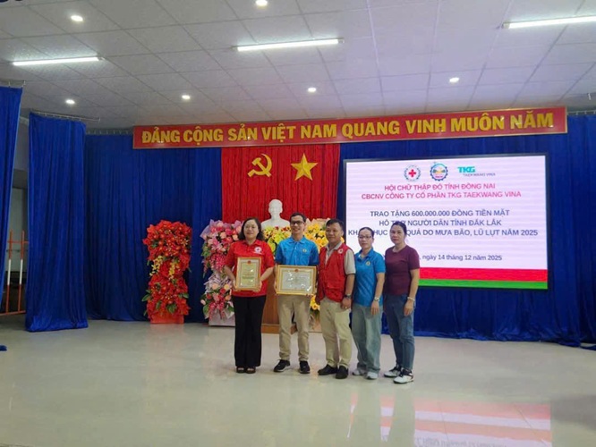 Nhằm kịp thời chia sẻ khó khăn với người dân bị ảnh hưởng bởi mưa, bão, lũ lụt năm 2025, ngày 14/12/2025, tại tỉnh Đắk Lắk, đoàn công tác Hội Chữ thập đỏ tỉnh Đồng Nai và BCH Công đoàn Công ty Cổ phần TKG Taekwang Vina đã tổ chức trao tặng 600 suất quà cứu trợ cho 600 hộ gia đình gặp nhiều thiệt hại trên địa bàn xã Phú Hoà 2 và phường Đông Hoà. Mỗi suất quà trị giá 1 triệu đồng, được trao trực tiếp tận tay các hộ dân bị ảnh hưởng nặng nề bởi thiên tai. Tổng giá trị đợt hỗ trợ lần này là 600 triệu đồng; Cụ thể: